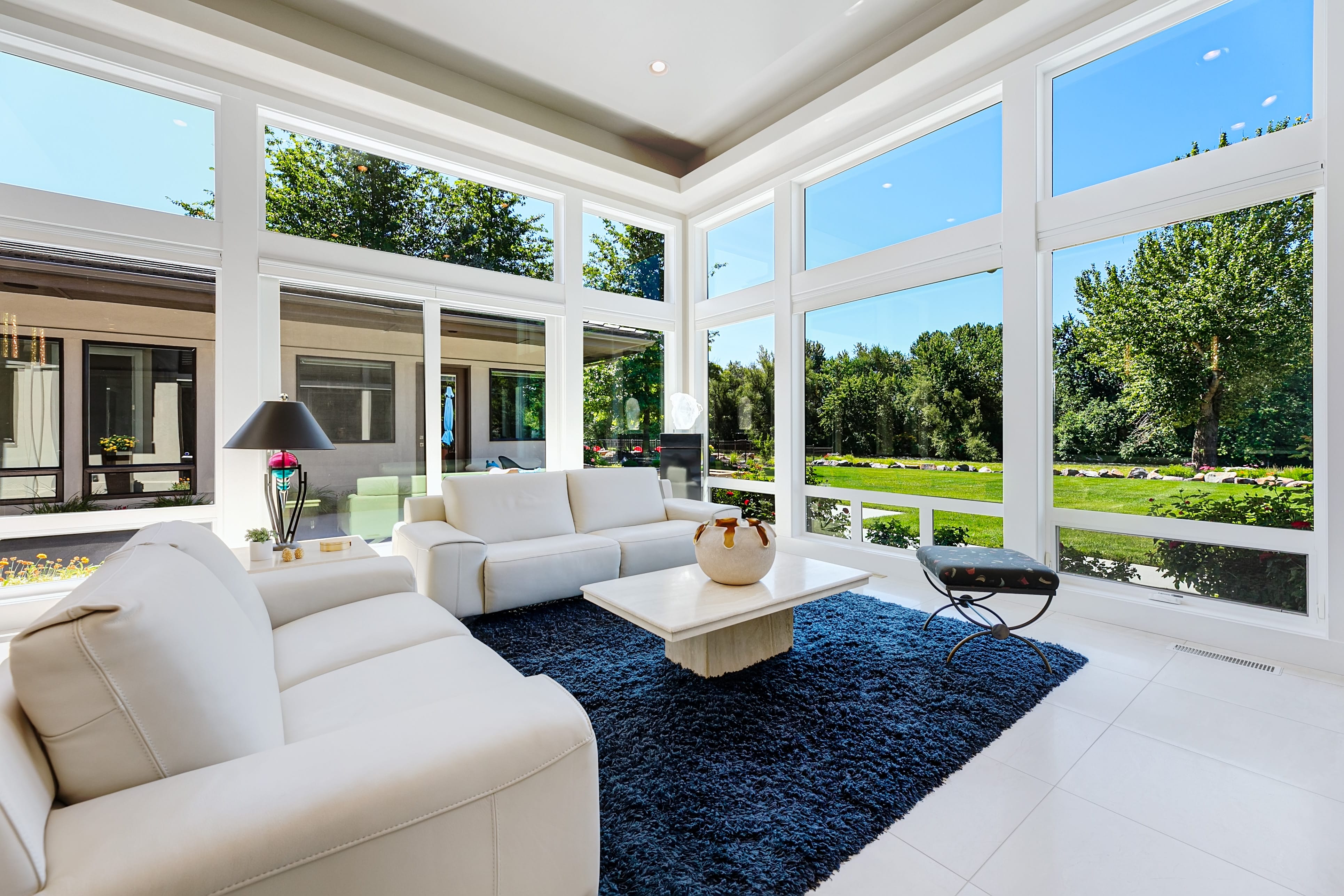 Inside, the home immediately opens to expansive ceilings, panoramic windows, and natural light that draws your attention straight to the river beyond. This is a home that celebrates its setting. Nearly every primary living space is positioned to frame the view, creating a seamless connection between indoors and out.